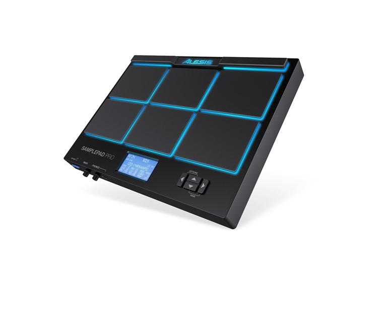 Pad percussivo in gomma ad 8 zone (di cui 6 ampie) retroilluminate da led di colore blu, dotato di 10 kit pronti all’uso basati su una wavetable integrata da 200 suoni di batteria, piatti e percussioni accessibile e suonabile anche via MIDI. Oltre ai suoni integrati, potrai caricare sui pad i tuoi campioni audio preferiti (max 20 kit) usufruendo di una card SD (opzionale) inseribile nell’apposito slot e gestibile via USB. Potrai espandere il sistema percussivo collegando due ulteriori trigger pad e sfruttare le connessioni kick e hi-hat trigger/switch presenti nel retro. Il display LCD e un editor software consentiranno una programmazione semplificata. Le connessioni audio dell’Alesis SAMPLEPAD PRO comprendono: stereo out (L/R) su connettori Jack da ¼”, uscita cuffia su Jack TRS da ¼” e ingresso audio ausiliare su mini jack TRS da 1/8”. Oltre alla porta USB sono presenti connessioni MIDI In & Out in formato DIN.