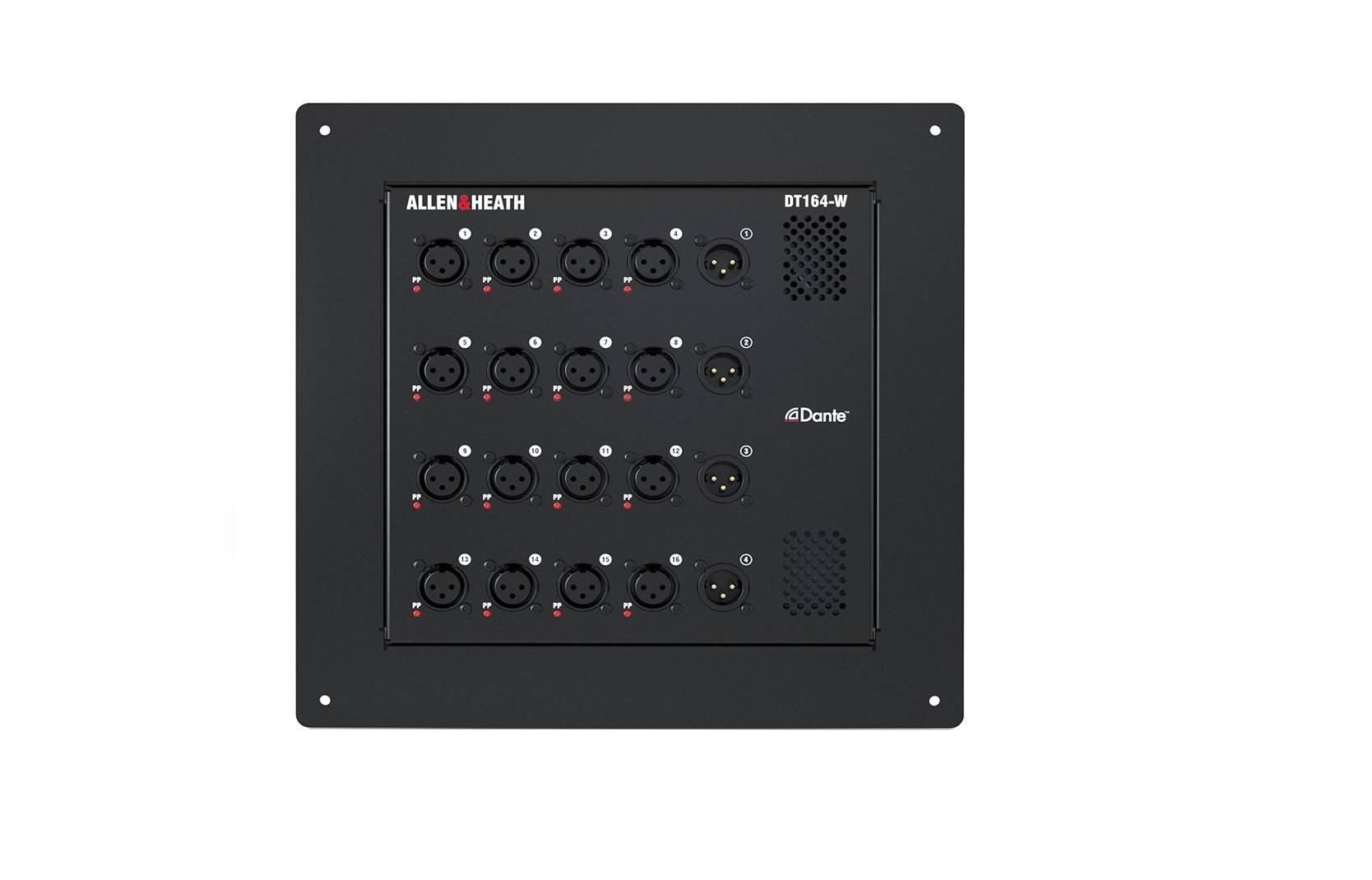 DT164-W offre gli acclamati preamplificatori Allen & Heath, completi di convertitori a 96kHz per la migliore qualità del suono rispetto a Dante, oltre a porte primarie e secondarie per il collegamento a margherita o la ridondanza tramite connettori EtherCon sicuri.