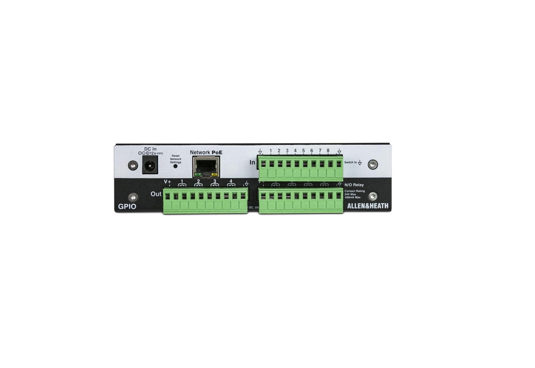 GPIO è un’interfaccia di commutazione IO generica per l’integrazione del controllo di un processore a matrice AHM o un sistema di missaggio dLive/Avantis e hardware di terze parti, che offre 8 ingressi optoisolati e 8 uscite relè normalmente aperte (N/O) su connettori Phoenix in aggiunta a 2 uscite +10 V CC