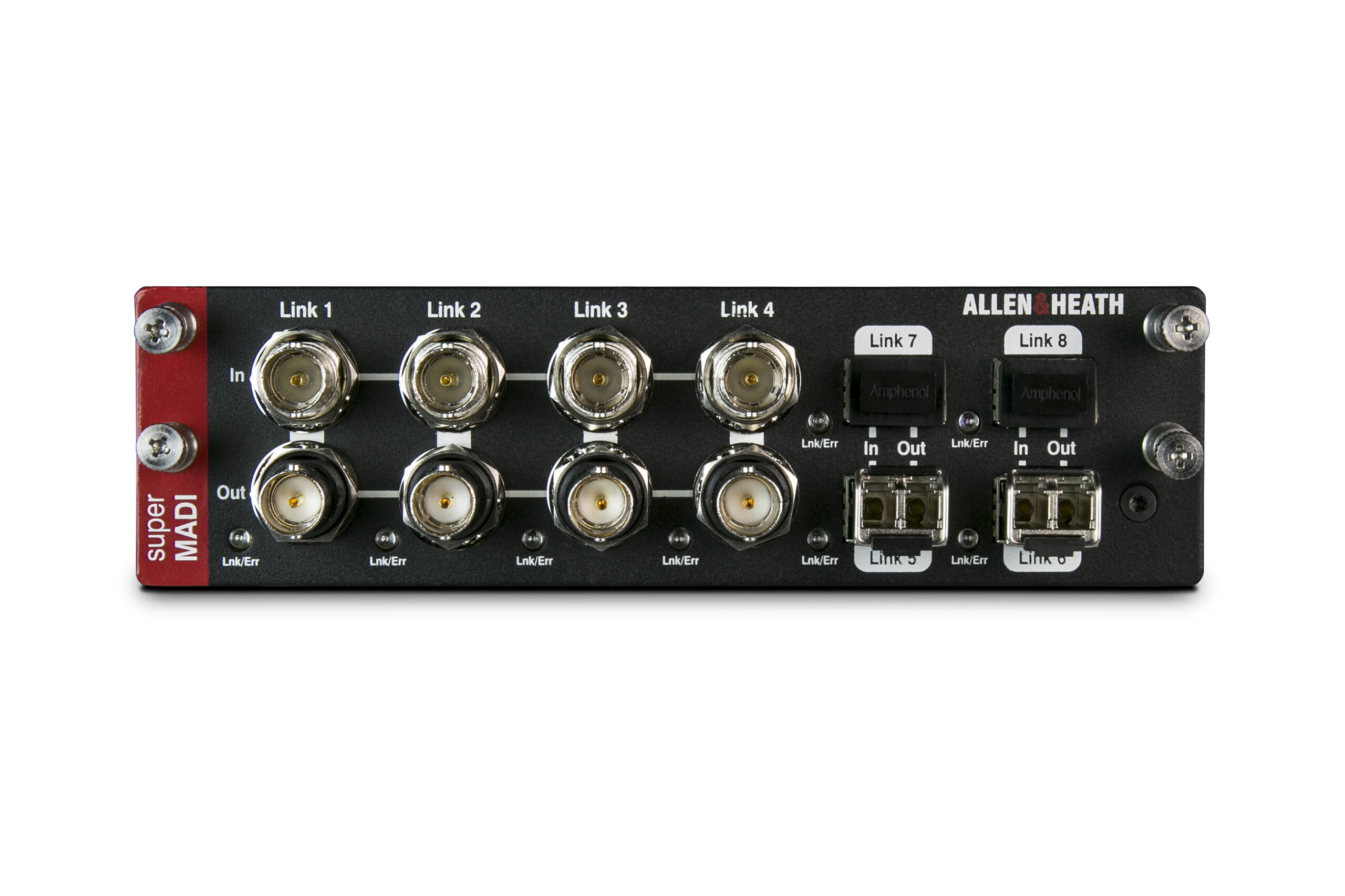 La scheda di rete audio superMADI (M-DL-SMADI-A) fa parte di un portafoglio di opzioni di rete audio che possono essere montate su qualsiasi porta I/O Allen & Heath dLive o Avantis. Progettata per integrare dLive e Avantis in un’ampia gamma di scenari di trasmissione, interfaccia live e registrazione, la scheda di interfaccia superMADI ha numerose possibilità di connettività, inclusi 8 connettori BNC e 4 slot SFP per ricetrasmettitori in fibra ottica (non inclusi). Entrambi i formati coassiale e ottico offrono fino a 128 I/O a 96 kHz ciascuno e la ridondanza e la frequenza di campionamento sono commutabili per coppia di collegamenti, con una scelta tra modalità Smux o HighSpeed 96 kHz. La scheda superMADI può essere utilizzata anche da ingegneri e società di noleggio per collegarsi a qualsiasi console di terze parti abilitata MADI, consentendo divisioni digitali ad alto numero di canali, ad esempio, tra FOH e monitor.