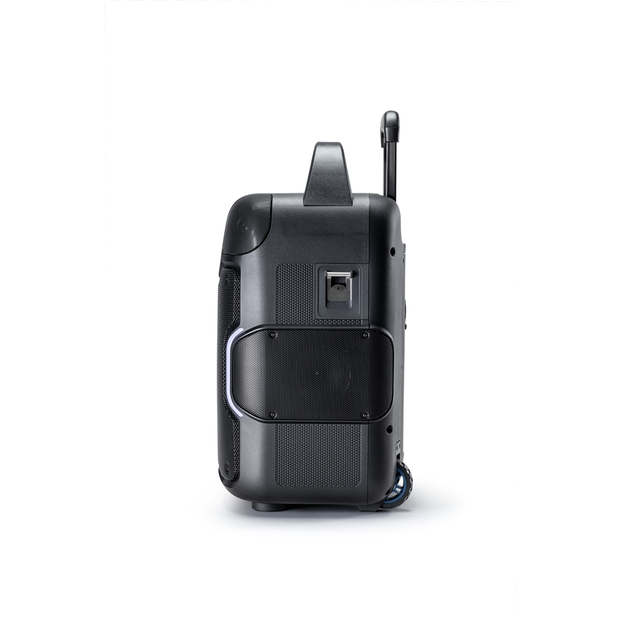 Incredibilmente facile da trasportare con la sua maniglia telescopica e le ruote: un vero e proprio trolley! UBER FX MK2 offre inoltre un comodo comparto di stoccaggio sul top del cabinet, un apribottiglie sul fianco, l’illuminazione del pannello frontale e due porte USB per la ricarica dei tuoi dispositivi.
