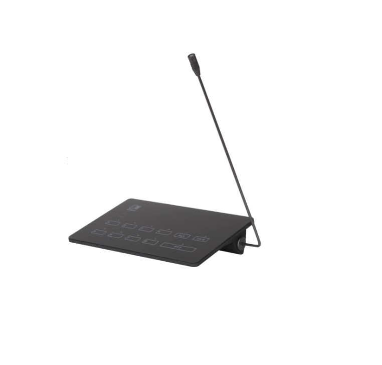 Base microfonica per paging per matrice MPX88. Pannello frontale in vetro con tasti touch e indicazione luminosa. Microfono integrato con lunghezza 25 cm. Connettore XLR3 per microfono con preamplificatore e phantom power. Connettore RJ45 per connessione e alimentazione a matrice MPX88. Tasto di attivazione chiamata. Dimensioni 221.5 x 43 x 111.6 mm, peso 0.4 Kg. Colore nero