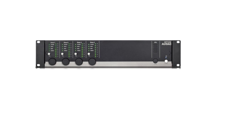 Matrice audio a 4 zone stereo, con 2 ingressi micro-linea con XLR3 e 4 ingressi stereo su RCA. Regolazione toni low-mid-hi su ingressi microfonici, gain e phantom power. Controllo tramite porta seriale RS232 o Ethernet mediante app AUDAC Touch (fino a 5 socket). Controllo dei parametri da pannello frontale tramite rotery encoder e led di stato. Possibilità di collegamento uno o più pannelli di controllo per ogni singola zona ( WP2xx opzionali). Ingresso RJ45 per collegamento basi paging con selezione zone (basi MTX48). Altoparlante frontale per preascolto singola zona. Contatto di mute esterno. Tasto accensione frontale. Alimentazione 100 ~ 240 V AC / 50 ~ 60 Hz oppure 24 VDC (backup). Dimensioni 482 x 88 x 335 mm , Peso 4.8 Kg.