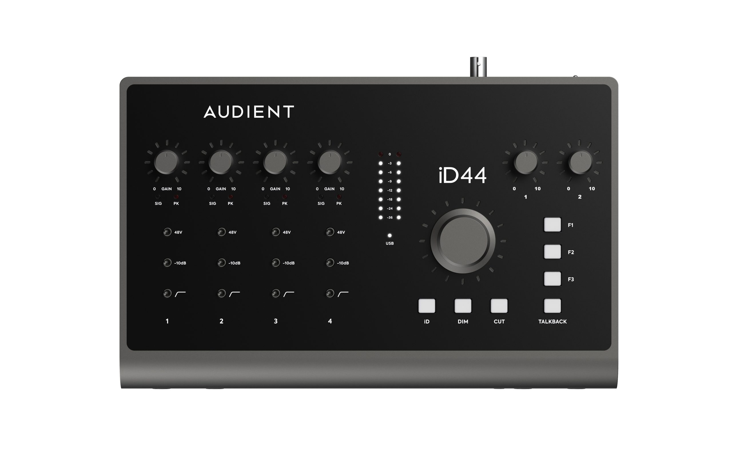 La nostra interfaccia audio più potente è appena migliorata. L’ultima generazione di iD44 vede prestazioni audio migliorate, funzionalità aggiuntive indispensabili e una bellissima nuova finitura grigio fumo. L’aggiunta di loop-back audio e una doppia uscita per cuffie, combinati con quattro preamplificatori microfonici Audient Console, convertitori leader della categoria, espandibilità ADAT e inserti bilanciati, significa che iD44 offre le prestazioni audio di una console Audient direttamente sul tuo desktop.