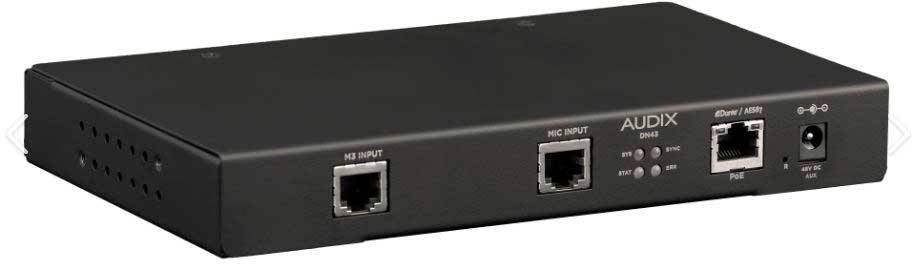 L’interfaccia del microfono DN43 è una parte fondamentale del sistema Audix Dante. Sistema microfonico integrato AES67, il modo più veloce e senza soluzione di continuità per offrire prestazioni audio Audix rinomate su reti Ethernet. L’audio di alta qualità e tutte le funzioni del microfono, tra cui l’accensione e lo spegnimento e gli indicatori di stato a LED, sono disponibili tramite un singolo cavo CAT5 – CAT7 con connessioni RJ45 sia sull’interfaccia che sul microfono. Questa configurazione estremamente semplice elimina guasti di saldatura, errori di cablaggio, accelera l’installazione e riduce notevolmente i costi. Il DN43 presenta un ingresso RJ45 per microfono progettato specificamente per il microfono pickup a tre elementi Audix M3 e un ingresso per microfoni a singolo elemento pickup entrambi dotati di uscita Audix RJ45. Dispone inoltre di due uscite logiche a 5 V per porta, con capacità sorgente / collettore per LED controllati DSP collegati alla rete. Sono disponibili impostazioni di filtro passa-alto e passa-basso su ciascun canale audio, così come otto livelli di guadagno selezionabili, con tutte le impostazioni configurabili via software.