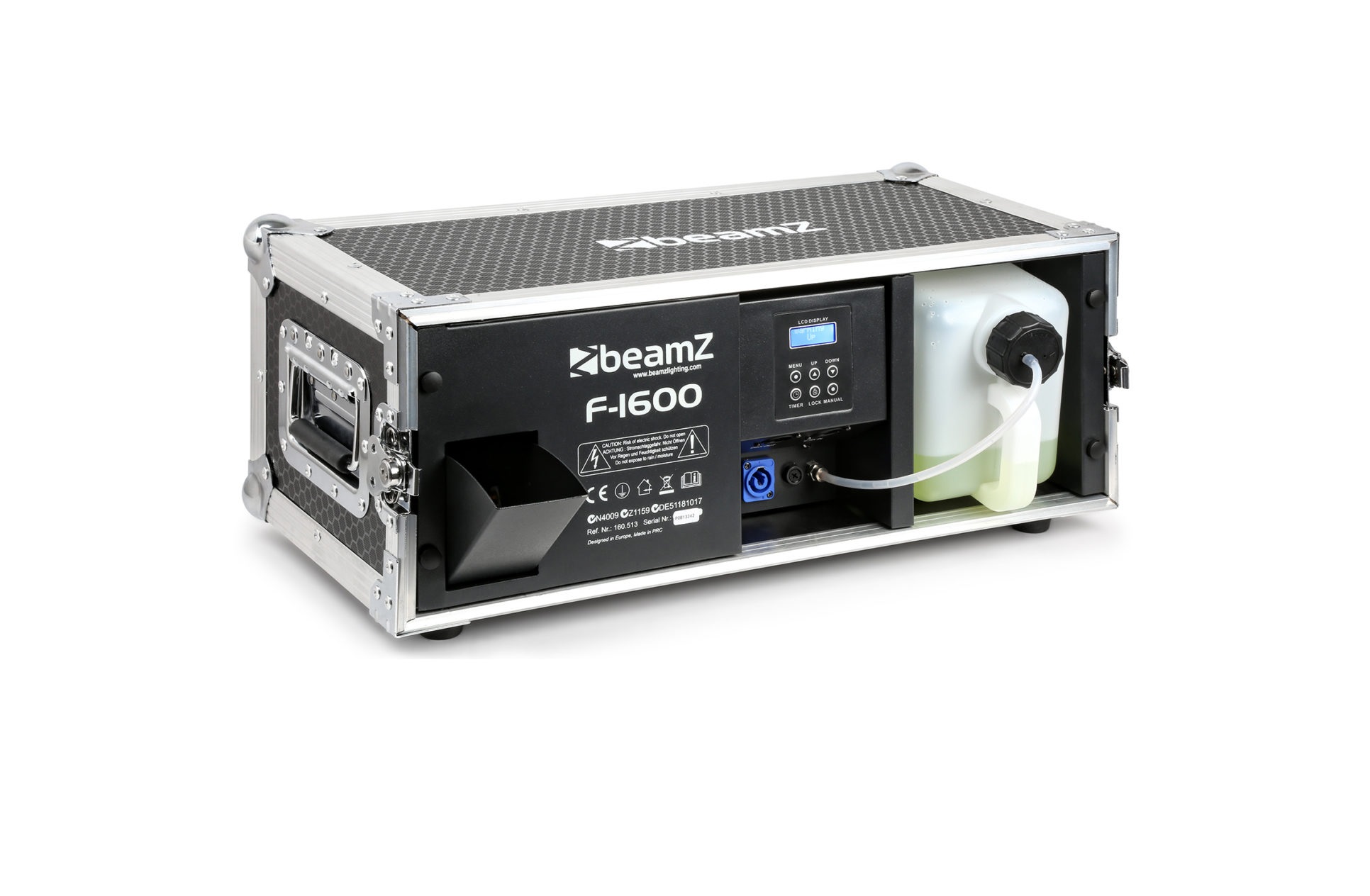 BeamZ F1600 è una macchina del fumo 2 canali DMX. È possibile controllare la ventola interna e l’uscita in modo indipendente. Con l’aiuto della ventola l’emissione di fumo sarà distribuita in modo sottile nella sala. La direzione del fumo può anche essere facilmente modificata con il deflettore dell’aria regolabile.