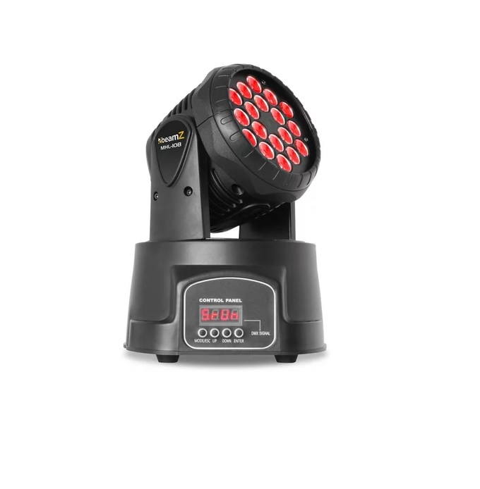 Una testa mobile DMX a 11 canali con 18 potenti LED da 3 W che producono un effetto wash colorato. Strobo elettronico regolabile e dimmer variabile, programmi macro, controllo avanzato delle funzioni, opzione di inversione di pan/tilt e controllo della velocità. Può essere usato da solo, master/slave o con controllo musicale.
