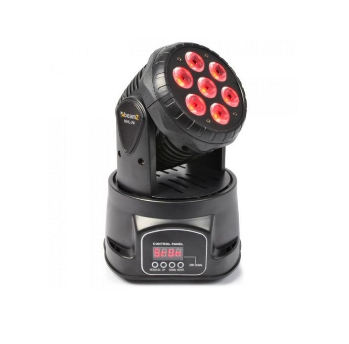 BeamZ MHL74 è una testa mobile wash a LED molto compatta per uso professionale in teatri, palcoscenici, concerti, studi televisivi, discoteche, ecc. Basata su 7 Quad LED da 10W per un’altissima resa luminosa che produce un ingegnoso show di luci con una perfetta miscela di colori. Angolo di proiezione di 15°, modalità DMX da 7 e 12 canali, strobo di colore, dimmer elettronico, ecc. Movimenti di pan a 540° e tilt a 180° armoniosi ma velocissimi.