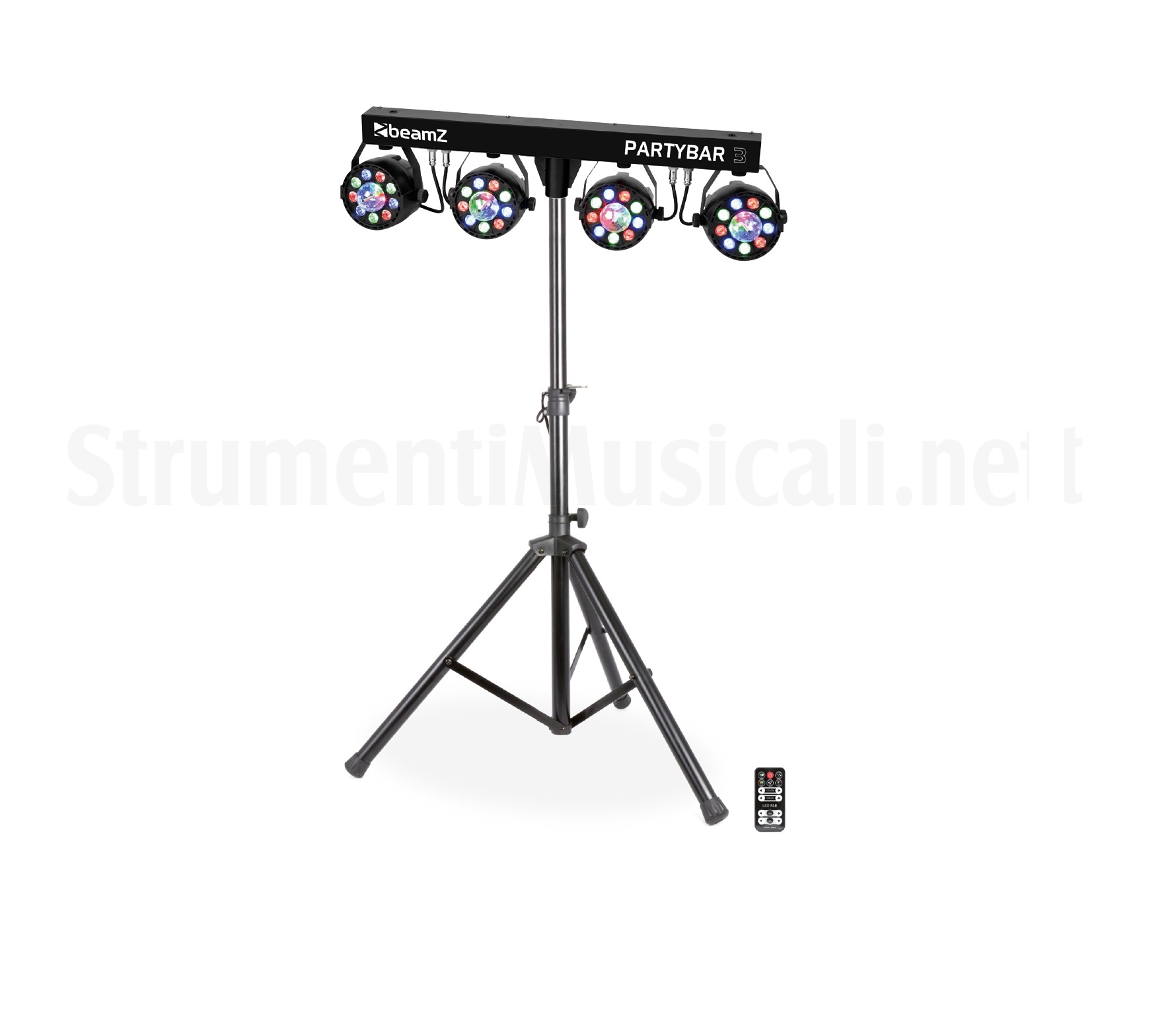 Partybar3 offre uno spettacolo luminoso sensazionale grazie a 4 fari PAR (LED RGB) con Magic Ball integrata. Questa Partybar3 è plug and play e può essere controllata tramite DMX, telecomando IR o programmi automatici e attivabili dalla musica selezionabili dal pannello di controllo. Un supporto a treppiede è incluso per un’installazione rapida e semplice. Appositamente progettato per palcoscenici, feste, animatori e tutti gli altri eventi speciali.