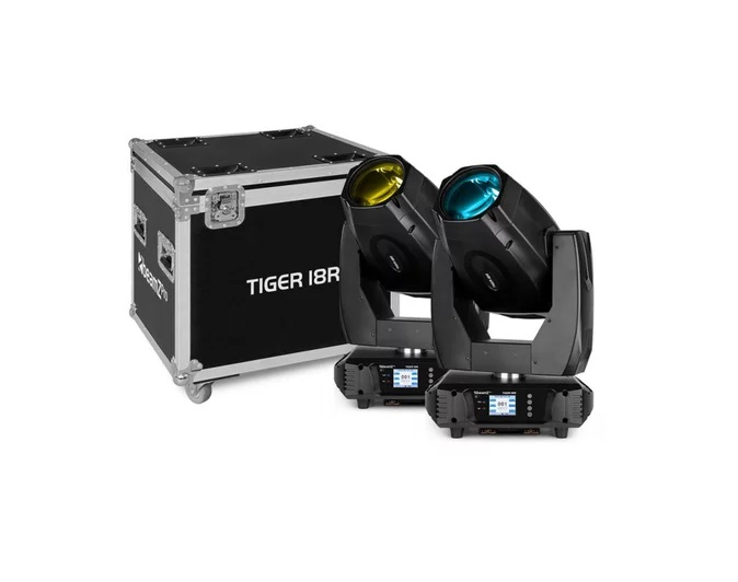 Kit completo con 2 teste mobili Tiger 18R 3-in-1 professionali, fornite in un robusto flightcase. Tiger 18R offre tre effetti: Fascio, Spot e Wash ed è equipaggiata con una lampadina a scarica ad alta intensità 18R da 380W. Ha anche una ruota colori (CMY) con effetti frost, gobo e doppio prisma per il massimo controllo. Funziona sia in modalità DMX che stand-alone. Quando si opera in modalità DMX si ha il controllo completo con 23 o 26 canali DMX. Tra le sue caratteristiche vi sono un otturatore meccanico e uno strobo a velocità regolabile, un filtro frost, un prisma rotante, la messa a fuoco motorizzata e un dimmer meccanico.