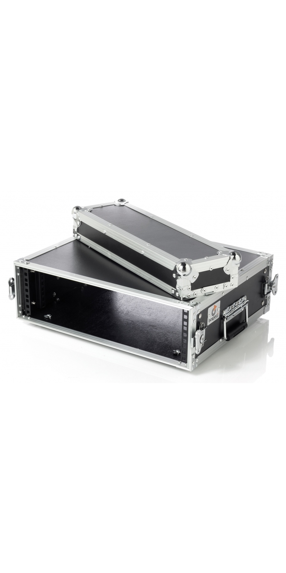 Coperchi con chiusure a farfalla. Robuste maniglie con molla di ritorno. Doppio profilo rack anteriore. Resistenti profili in alluminio anodizzato argento. Gommini antiscivolo. Colore nero