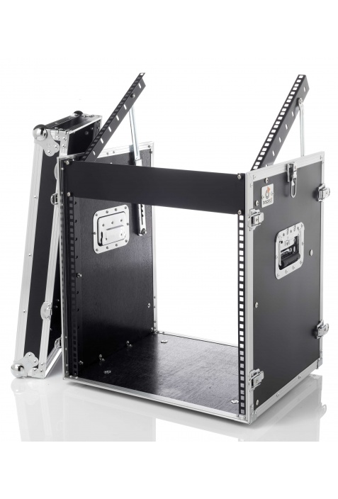 Coperchi con chiusure drawbolt e chiave. Robuste maniglie a scomparsa con molla di ritorno. Profilo rack anteriore e superiore con alzata regolabile. Resistenti profili in alluminio anodizzato argento. Gommini antiscivolo. Colore nero