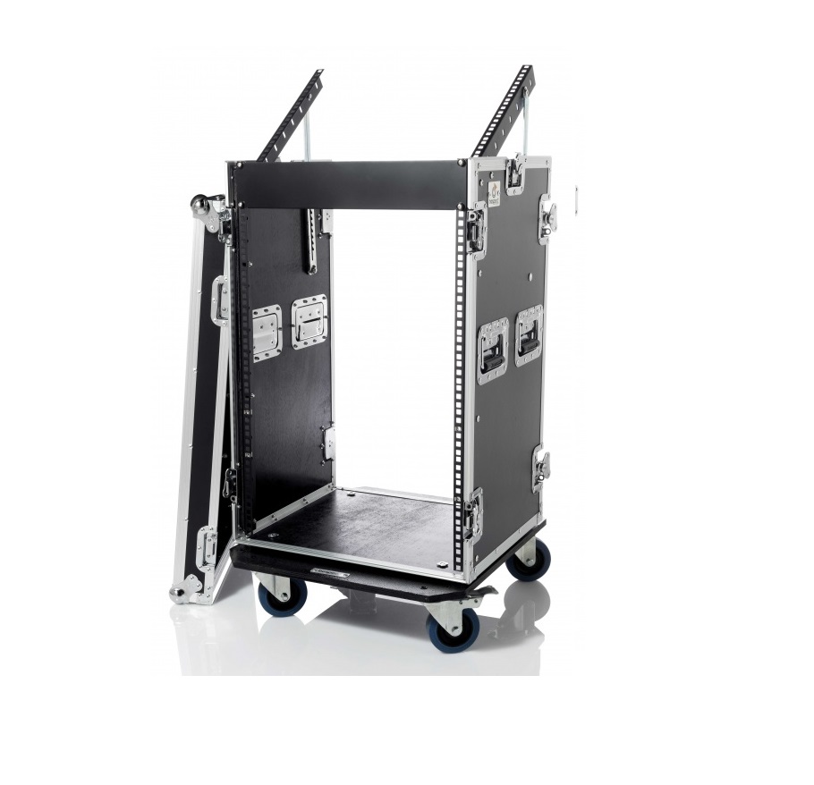 Realizzati in legno multistrato di pino marino da 9 mm e laminato antigraffio. Coperchi con chiusure a farfalla a scomparsa. Robuste maniglie con molla di ritorno. Resistenti profili in alluminio anodizzato argento. Profilo rack anteriore e superiore con alzata regolabile. Colore nero