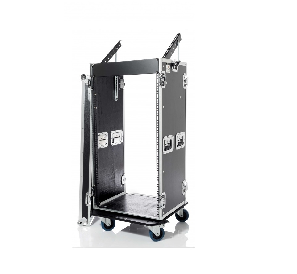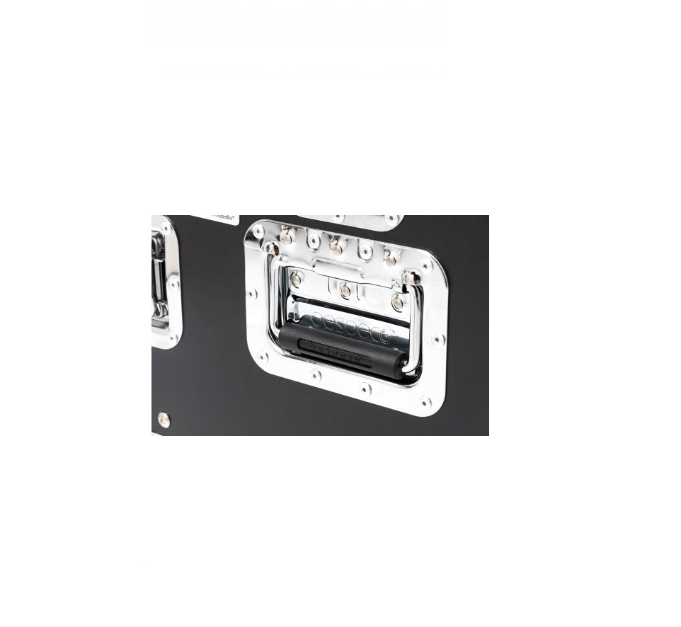 Coperchi con chiusure a farfalla a scomparsa. Robuste maniglie con molla di ritorno. Resistenti profili in alluminio anodizzato argento. Profilo rack anteriore e superiore con alzata regolabile. Carrello con 4 ruote professionali da 100 mm di cui due frenanti. Colore nero