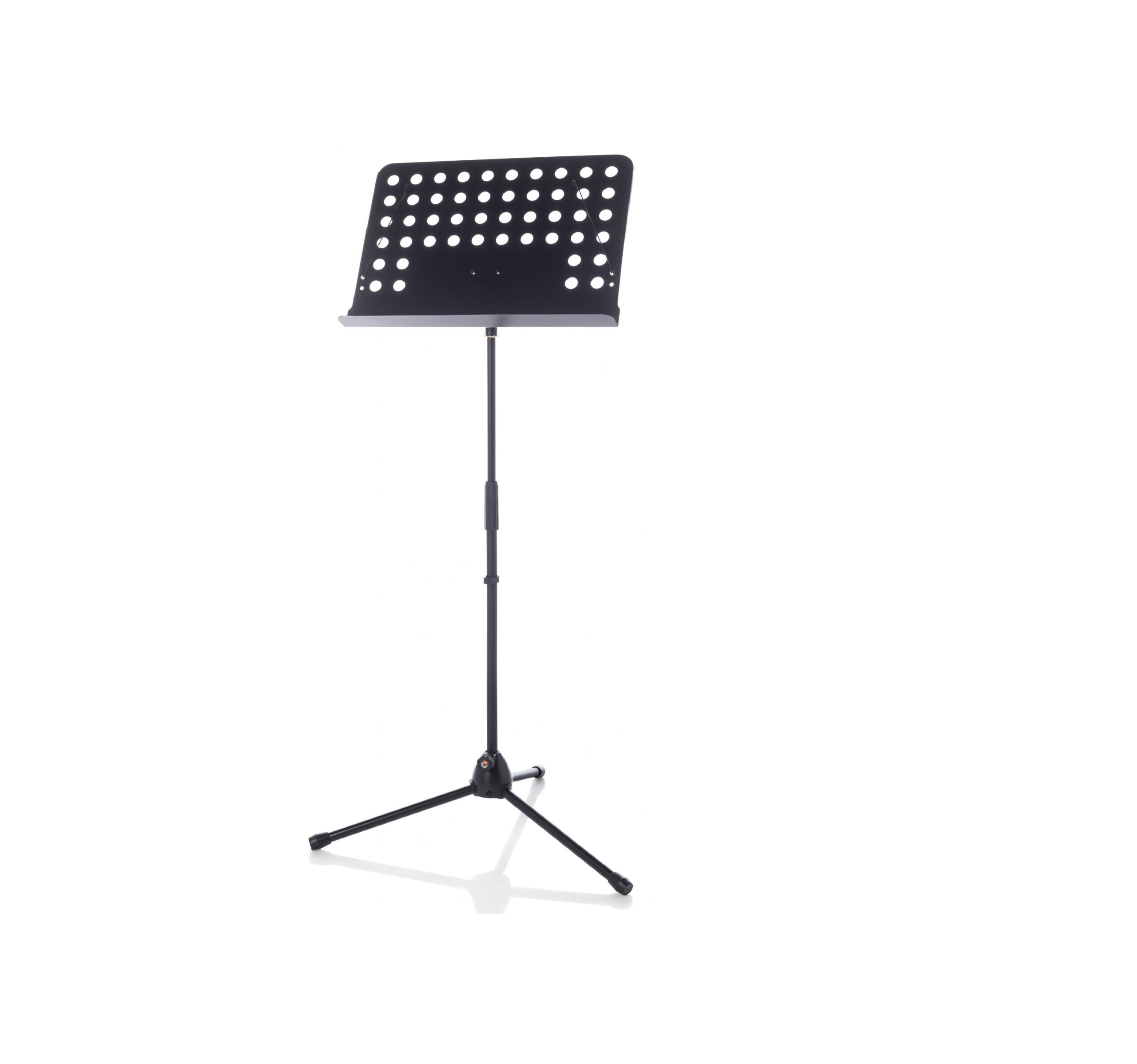 Leggio professionale in acciaio con tavola in lamiera forata estraibile.