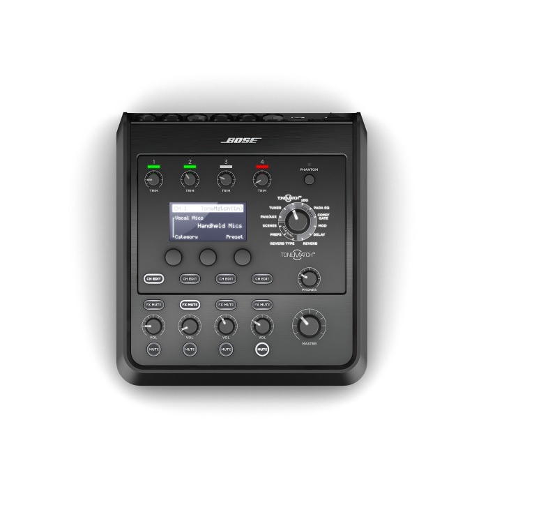 Il mixer ToneMatch T4S, ultra compatto a 4 canali, è specificatamente progettato per fornire all’artista il pieno controllo della propria musica. Grazie a un potente motore DSP e alle intuitive opzioni di controllo, il T4S offre EQ, dinamica ed effetti con qualità da studio. L’integrazione del processing Bose ToneMatch e di zEQ garantisce un sound ottimo, specialmente quando collegato a un sistema Bose L1 o F1 per il più completo controllo timbrico. Il robusto T4S consente di ottenere ottimi risultati on stage, grazie ai controlli tattili, al display a LED di facile lettura e ai richiami di scenari. Il T4S è uno strumento essenziale per gli artisti.