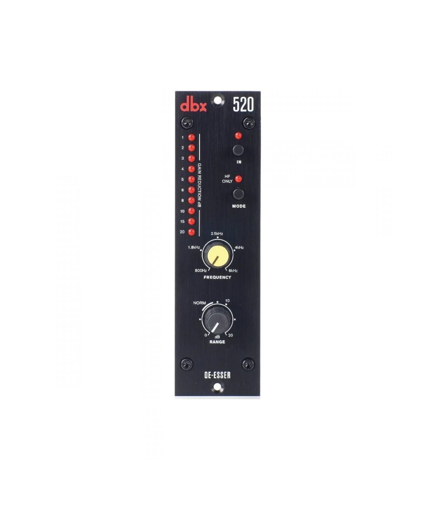 Il dbx 520 analizza la differenza di dB tra l’alta frequenza e le parti ad ampiezza di banda piena di un segnale permettendo l’eliminazione delle sibilanti in segnali con cambi di livello fino a 60dB. Il controllo di frequenza varia da 800Hz a 8kHz, misurazione di Gain Reduction a LED su scala estesa e gamma di De-essing da 0dB A 20dB.