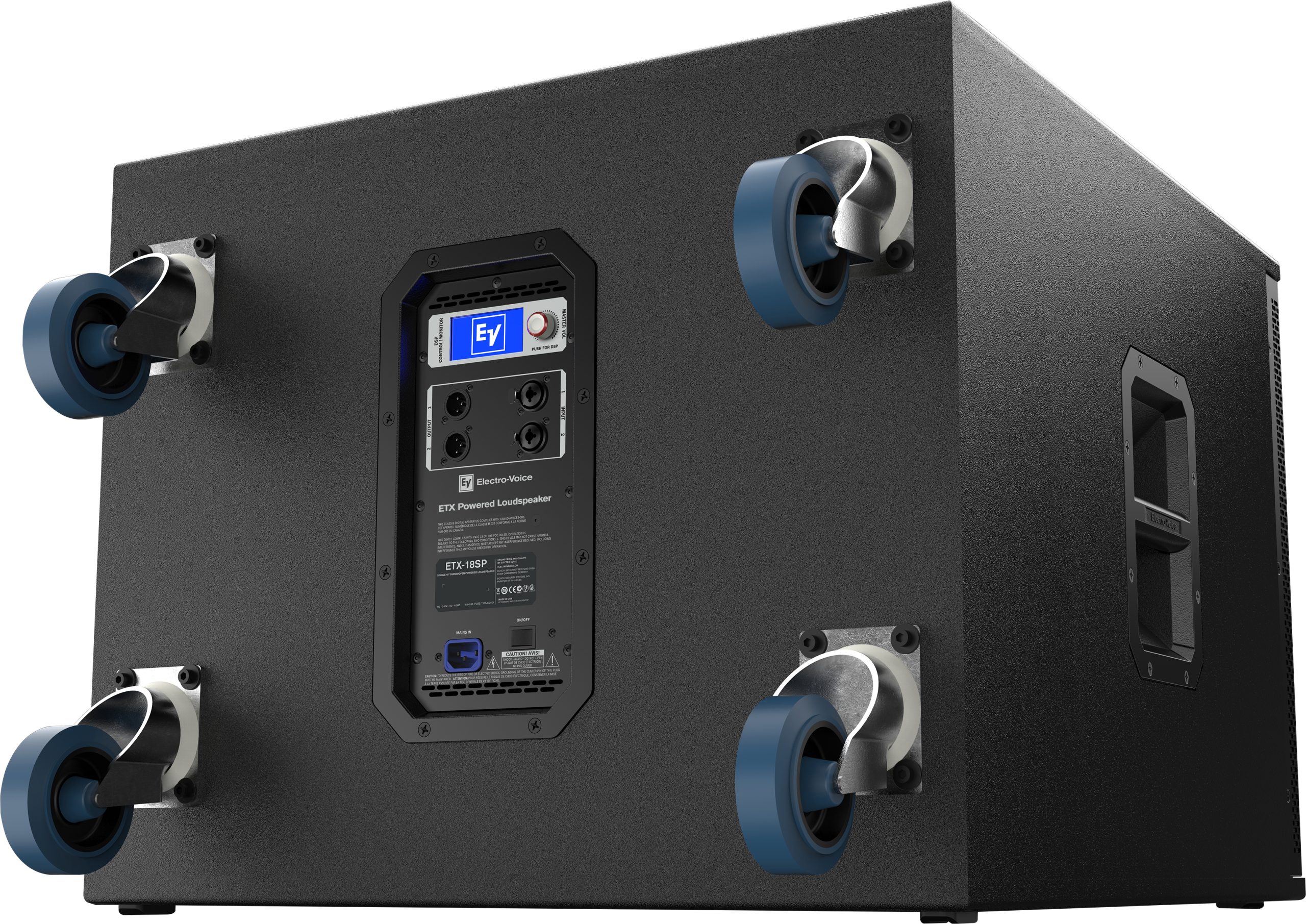 Modulo subwoofer autoalimentato progettato come rinforzo delle basse frequenze per i sistemi full range della serie ETX. Cassa di forma asimmetrica costruita in compensato di betulla da 18 mm, rivestita in EVCoat, finitura nera. Include 2 maniglie e 4 rotelle per il trasporto, staffa combinata treppiede/asta con filettatura M20. VLF: 1 altoparlante a cono da 18′ (DVX3180A). Include 1 modulo di potenza da 1.800 W, DSP con display LCD ed encoder associato, elaborazione FIR-Drive, preset di equalizzazione per modalità di applicazione e posizione (normale / cardioide), 1x PEQ, ritardo da 0 a 343 m regolabile in intervalli da 0,25 m, filtro Lo-Pass regolabile per la combinazione con sistemi full range, selettore di polarità. 2 ingressi con connettori XLR-Jack¼’ Combo, 2 uscite parallele con connettori XLR. Risposta -10dB: 32Hz – 180Hz.SPL massimo: 135dB. Dimensioni (HxLxP): 471 x 576 x 825 mm. Peso: 51,8 kg