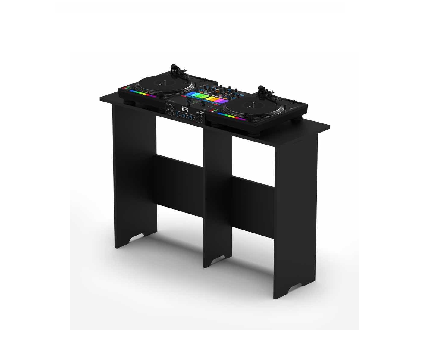 Console per DJ in MDF, facile da montare, dotata di ampio piano d’appoggio per un setup DJ completo con 2 giradischi/CD player e mixer a 4 canali, appositi incavi e fori per facilitare il posizionamento dei cavi. Colore nero.