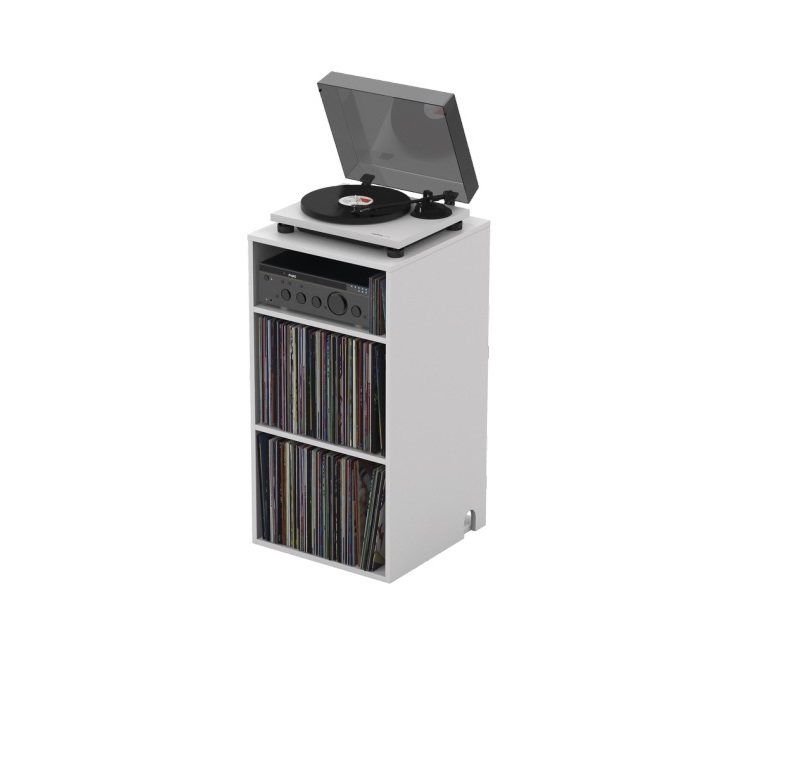 Tavolo per DJ in MDF, facile da montare, composto da 4 scomparti per fino a 200 dischi da 12 ” e 2 scomparti per fino a 120 dischi da 7″, vano con chiusura per un amplificatore e cavi, oltre ad un ampio piano di appoggio (con fori passa cavi) per un setup DJ completo. Grazie al rivestimento frontale in acrilico con effetto vetro opaco può essere eventualmente illuminato tramite strisce LED disponibili opzionalmente. Dimensioni 480 x 910 x 1350 mm, peso 42,3 kg, colore bianco.