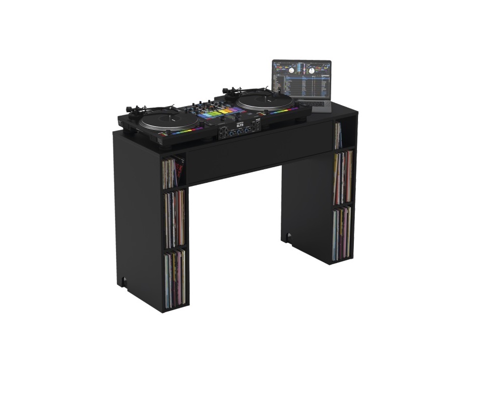 Tavolo per DJ in MDF, facile da montare, composto da 4 scomparti per fino a 200 dischi da 12 ” e 2 scomparti per fino a 120 dischi da 7″, vano con chiusura per un amplificatore e cavi, oltre ad un ampio piano di appoggio (con fori passa cavi) per un setup DJ completo. Grazie al rivestimento frontale in acrilico con effetto vetro opaco può essere eventualmente illuminato tramite strisce LED disponibili opzionalmente. Dimensioni 480 x 910 x 1350 mm, peso 42,3 kg, colore nero.