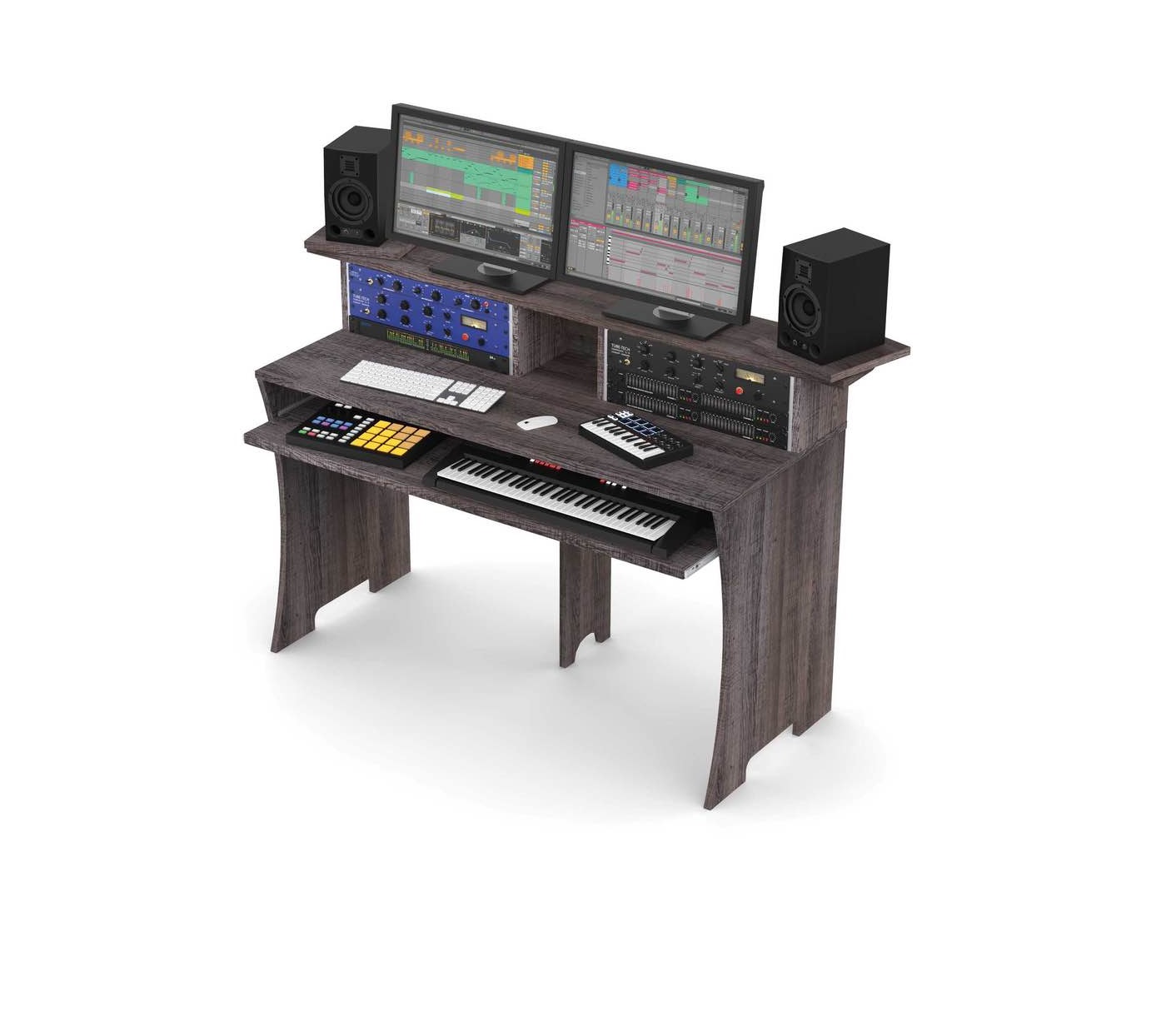 Console di lavoro compatta e con un design ben organizzato, ideale per le workstation di produzione musicale, dotata di piano estraibile per master keyboard, 2 alloggiamenti da 4U rack 19″, spazio per CD/DVD, libri o altro, con foro passacavi, piano di appoggio dimensionato per accogliere tastiera, mouse, mixer, controller o altro, piano rialzato per uno o due monitor video, piani di appoggio girevoli per monitor audio, realizzazione in legno MDF da 20 mm.
