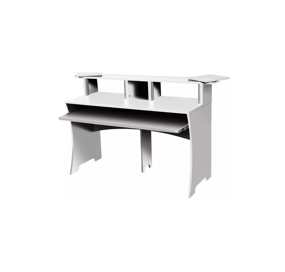Consolle di lavoro compatta e con un design ben organizzato, ideale per le workstation di produzione musicale, dotata di piano estraibile per master keyboard, 2 alloggiamenti da 4U rack 19″, spazio per CD/DVD, libri o altro, con foro passacavi, piano di appoggio dimensionato per accogliere tastiera, mouse, mixer, controller o altro, piano rialzato per uno o due monitor video, piani di appoggio girevoli per monitor audio, realizzazione in legno MDF da 20 mm, dimensioni 1520 x 958 x 551 mm (massimo ingombro inclusi i piani di appoggio per i monitor, 1560 x 980 x 580 mm), peso 39,5 kg, assemblaggio semplice e senza problemi, colore bianco.