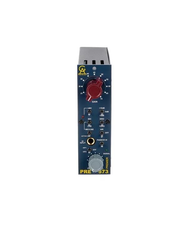 Pre microfonico in formato rack serie 500 di altissima qualità ad 1 canale, versione PREMIER del modello PRE-573 MKIII, realizzato con componenti discreti di ancora maggiore qualità e trasformatori Carnhill indipendenti per ingresso mic, instrument e uscita, equipaggiato con un circuito ispirato al famoso Neve 1073, ingressi Mic con connettore Combo, Line con connettore Combo e Instrument ad alta impedenza con Jack TRS da 1/4″, insert con Jack TRS da 1/4″, ingresso DI attivo con impedenza di 1.5Mohm, mic gain regolabile fino a 80dB, impedenza ingresso microfonico regolabile a 300 o 1200 Ohm, Air mode che aggiunge un leggero boost sopra i 10KHz ed un jumper per ridurre l’impedenza d’ingresso e aumentare ulteriormente l’effetto Air, high pass filter 45/180Hz, inversione di fase, phantom power a 48V, indicatore di livello a LED, regolazione livello di uscita.