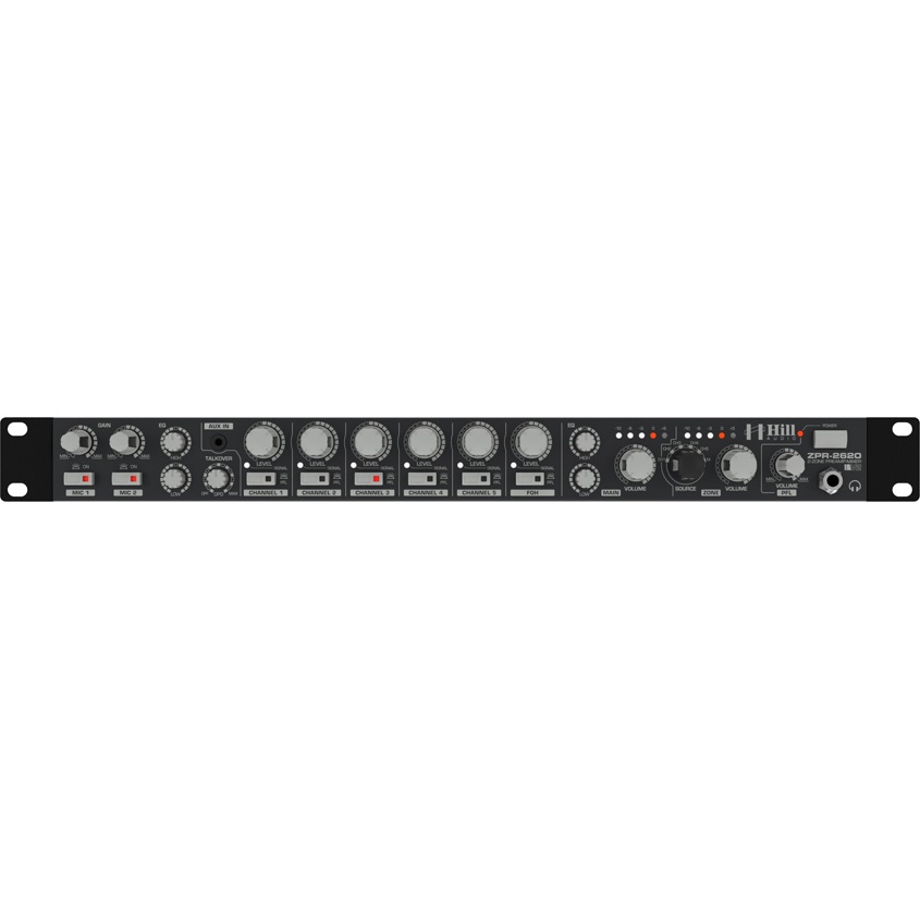 Il mixer ZPR2620V2 2-Zone è l’unico mixer con installazione a 1U con sistema CascadeZone© di Hill Audio, che consente alla 2a uscita di agire sia come un secondo master o come una seconda zona. Ogni uscita prevede controlli di configurazione completi nel pannello posteriore. I 2 ingressi microfonici sono integrati da 6 ingressi stereo, dei quali due sono equipaggiati di switch per la selezione di ingresso linea/microfono – che rende la ZPR2620 un mix unico tra mixer microfono e mixer di linea stereo. Un’altra innovazione Hill Audio è l’ingresso FOH, che fornisce una soluzione ideale per locali con occasionali eventi di musica dal vivo – permette di alimentare il sistema FOH con un segnale di ingresso stereo bilanciato esterno. Il ZPR2620V2 è la scelta predefinita per il controllo della musica nei locali in cui viene ospitata.