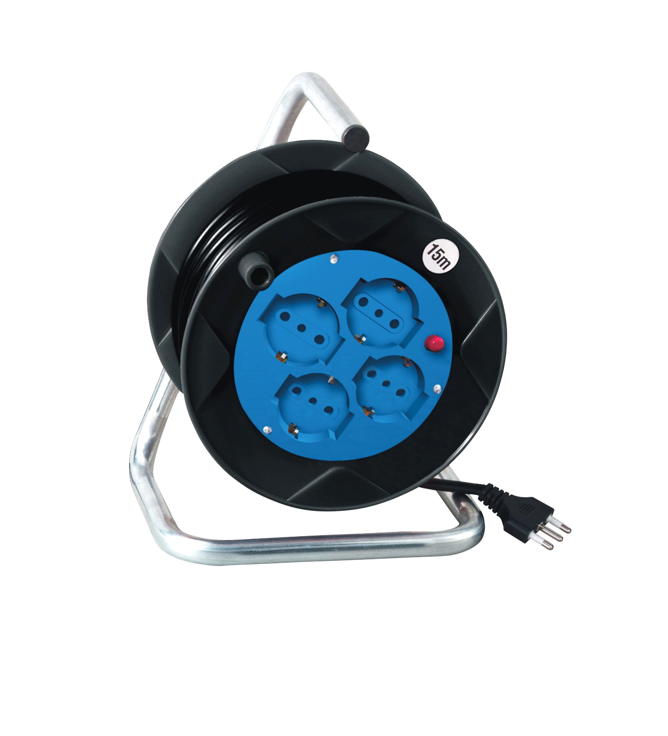 Prolunga elettrica da 15mt con spina 16A e 4 prese tripasso 10A, 16A e schuko. Dotata di pratica maniglia di trasporto e di pomello per il rapido riavvolgimento. Il cavo è composto da 3 fili da 1,5mm con guaina esterna nera. Accanto alle prese è presente una protezione termica ripristinabile tramite semplice pressione.
