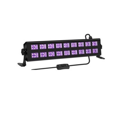 Il DOUBLE UV18 è un proiettore in grado di illuminare una vasta area ricreando l’effetto di WOOD. Gli oggetti bianchi risalteranno con grande effetto scenico. Semplice da utilizzare: è sufficiente agire sul tasto di accensione presente sul cavo di alimentazione. Il raggio operativo è di 65° con una proiezione che arriva a circa 5mt.