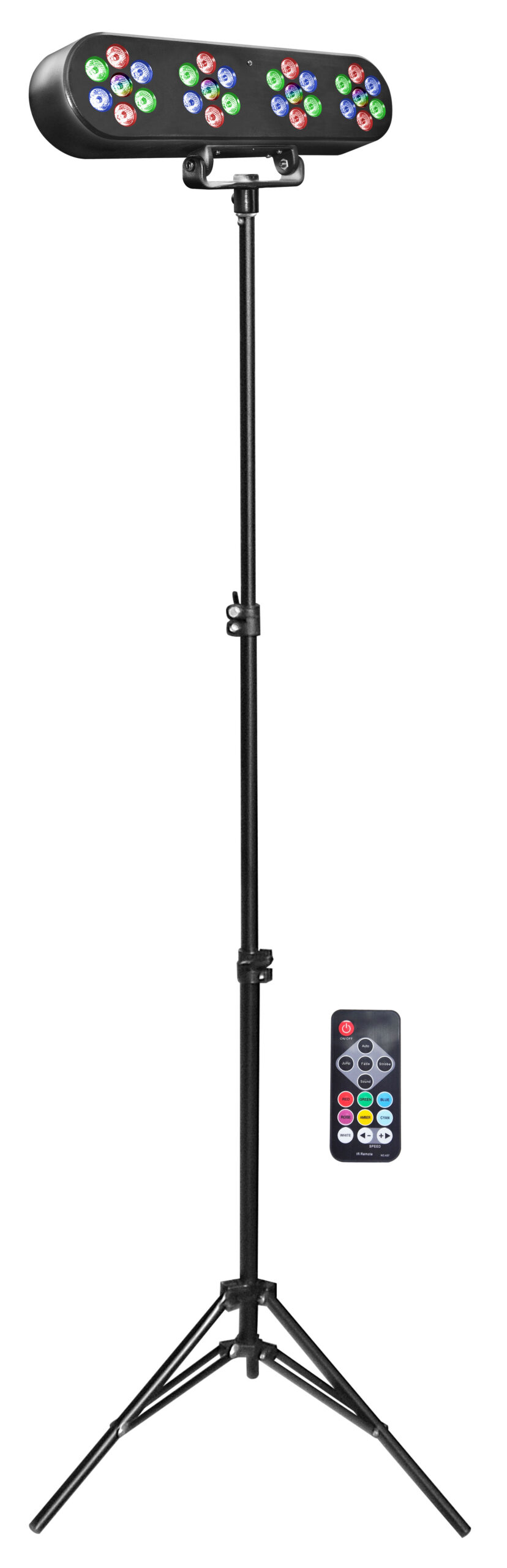 Effetto luce trasportabile dalle ridotte dimensioni ma dalla resa straordinaria. E’ composto da un supporto a treppiede e da una barra comprensiva di 4 illuminatori a led RGB. In totale sono presenti 28 led. E’ sufficiente collegare il cavo di alimentazione alla presa elettrica domestica e agire sul tasto posteriore per attivare l’apparecchio. Le modalità disponibili sono: funzionamento automatico o a tempo di musica. E’ possibile inoltre controllare numerosi parametri quali colore, velocità etc. direttamente tramite il telecomando incluso