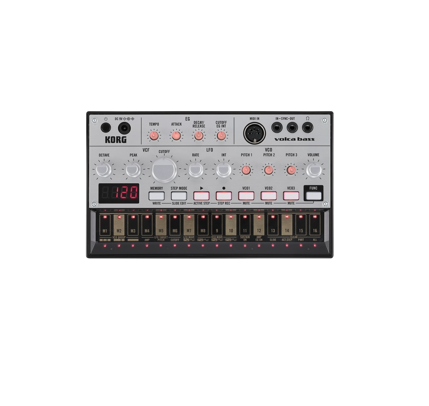 Se utilizzati insieme, i tre oscillatori possono essere leggermente discordanti per suoni corposi. Il Volca Bass utilizza un nuovo circuito di filtro sviluppato appositamente per le basse frequenze che offrono un suono nitido e più brillante quando completamente aperto, ampio e rotondo quando il cut off è ridotto. Korg ha incluso anche un controllo della risonanza e la possibilità di portare il filtro in distorsione, perfetto per linee di basso acide. La sezione sequencer del Korg Volca Bass è un diretto discendente dell’Electribe rendendo più semplice aggiungere o rimuovere notazioni al volo. Ci sono 16 tasti facili da usare che consentono di inserire singole note, mentre si ottiene un feedback a LED dalla posizione nella sequenza. È possibile anche inserire note in tempo reale utilizzando la tastiera del touch panel e si possono memorizzare nella memoria interna fino a otto modelli di sequenze.