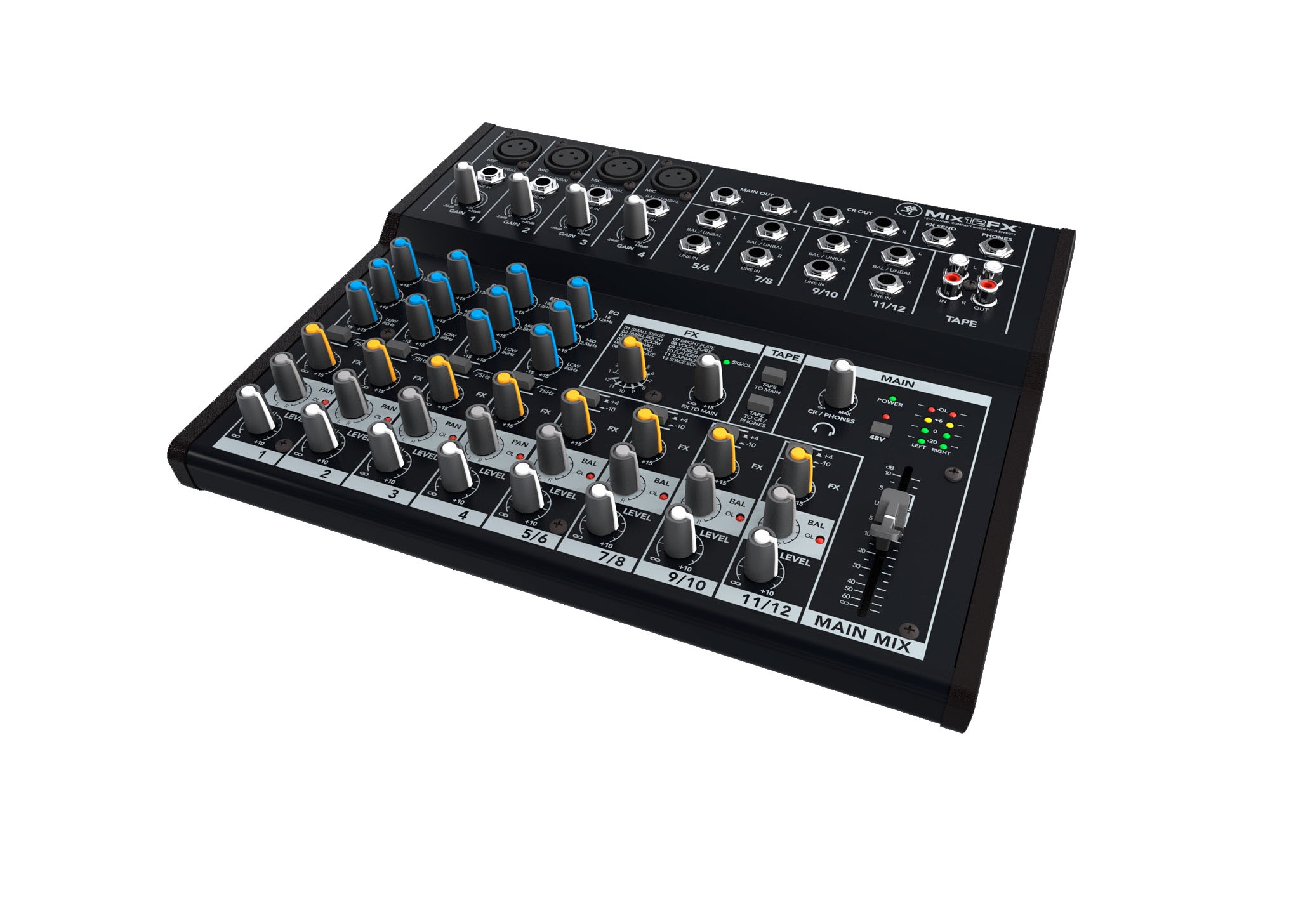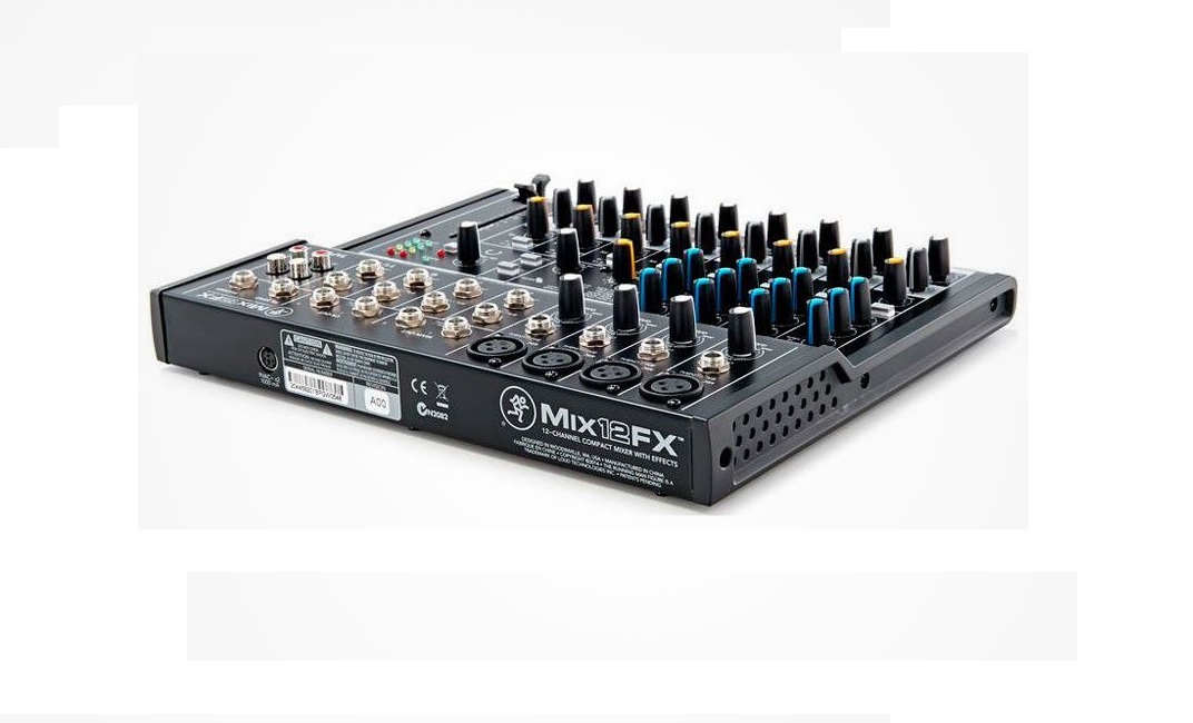 Mixer Mackie Mix12Fx. Mixer compatto a 12 canali ad alte prestazioni e basso rumore. 4 ingressi microfonici / linea con qualità audio a livello di studio: EQ a 3 bande su tutti i canali con formazione di toni puliti e precisi, filtro passa basso (75 Hz), indicazione Pan, livello e sovraccarico – Alimentazione phantom per microfoni a condensatore. 4 ingressi linea 1/4 stereo: funzionamento + 4 / -10 dB, bilanciamento, livello e indicazione di sovraccarico. 12 effetti integrati, tra cui riverberi, chorus e delay. Ingressi / uscite RCA stereo dedicati. Fader da 60 mm per le uscite principali L / R. Uscite stereo cuffie e controllo di ritorno indipendente. Design robusto e affidabile costruito per durare. Estremamente compatto e portatile.