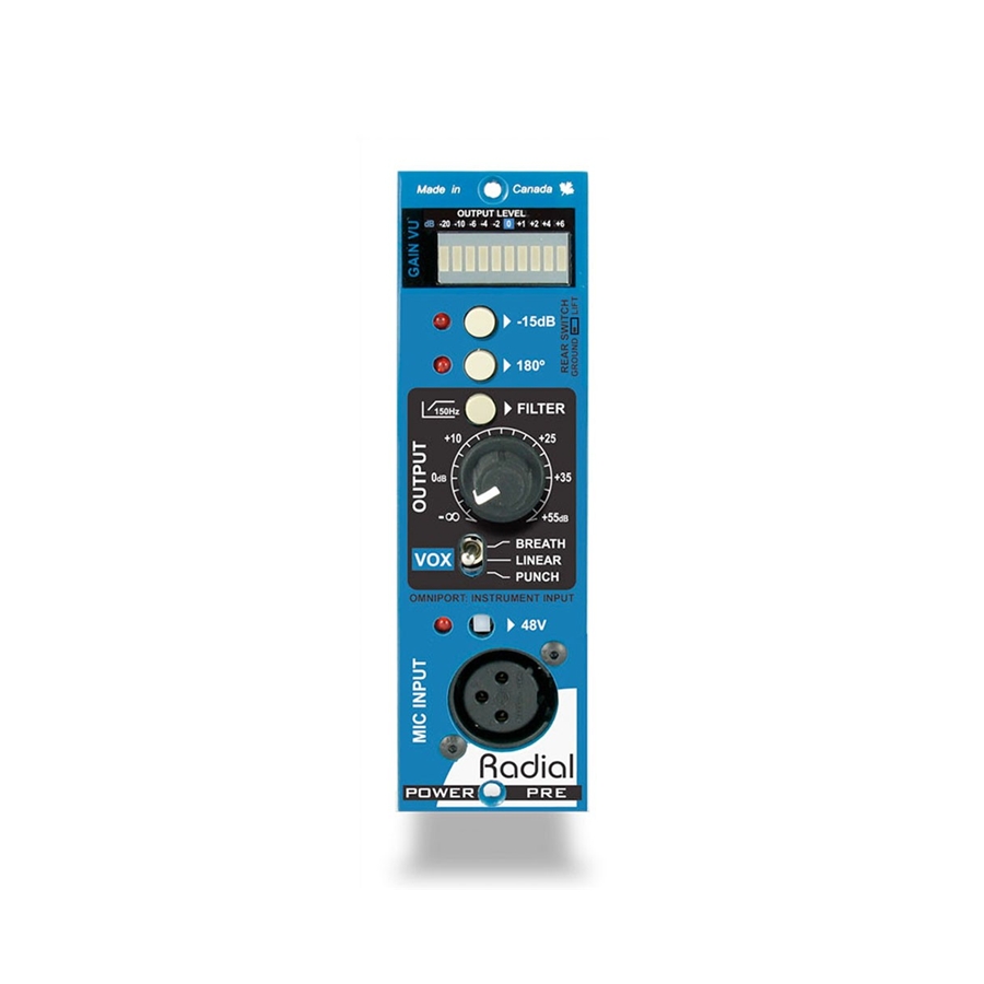Preamplificatore discreto (100%) con controllo della voce a 3 posizioni, uscita con trasformatore, ingresso XLR e per strumento. Inversione della polarità (180°). Ground lift.