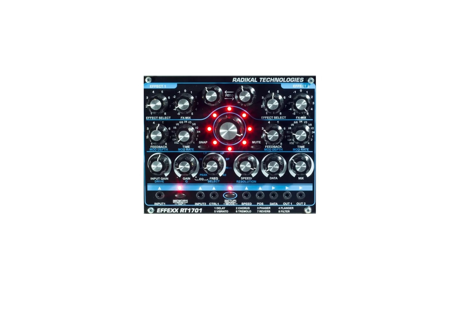 Unità multi-effetto in formato Eurorack dotata di stadio di ingresso con guadagno/drive regolabile, sezione EQ/Filtro multimodo, due DSP indipendenti con 8 effetti selezionabili (Reverb, Delay, Chorus, Phaser, Flanger, Tremolo, Vibrato e Filter), snapshot con possibilità di morphing controllabile mediante manopola dedicata, LFO interno e segnale CV esterno, 8 programmi ciascuno con 8 snapshot, 2 ingressi e 2 uscite audio, percorso del segnale stereo, parametri CTRL 1, Speed, POS e Data controllabili via CV. Consumo: 12 Volt, 250 mA; -12 Volt, 40 mA; 5 Volt, 0 mA. Dimensioni: 3 HE, 32 TE, 30 mm di profondità..