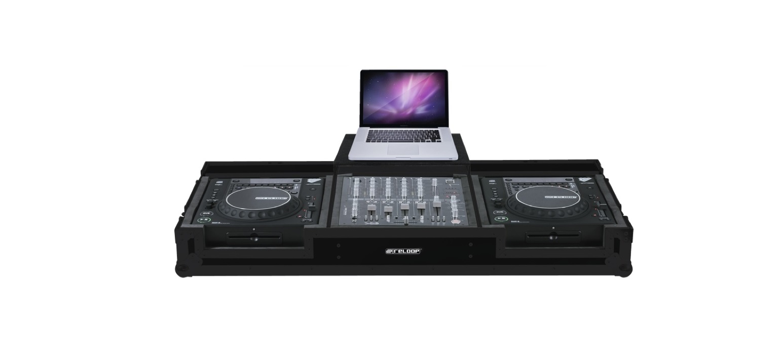 Robusto flight-case professionale in legno rivestito, per il trasporto di due CD Player Reloop serie RMX (o Pioneer CDJ-1000, o altri similari) e un mixer Reloop RMX-40 (o Pioneer DJM-800, o altri similari), dotato di mensola per il posizionamento di un computer portatile, maniglie a scomparsa, angoli rinforzati, imbottitura interna, chiusure di sicurezza, dimensioni 1138x 230 x 490 mm, peso 18,1 kg.