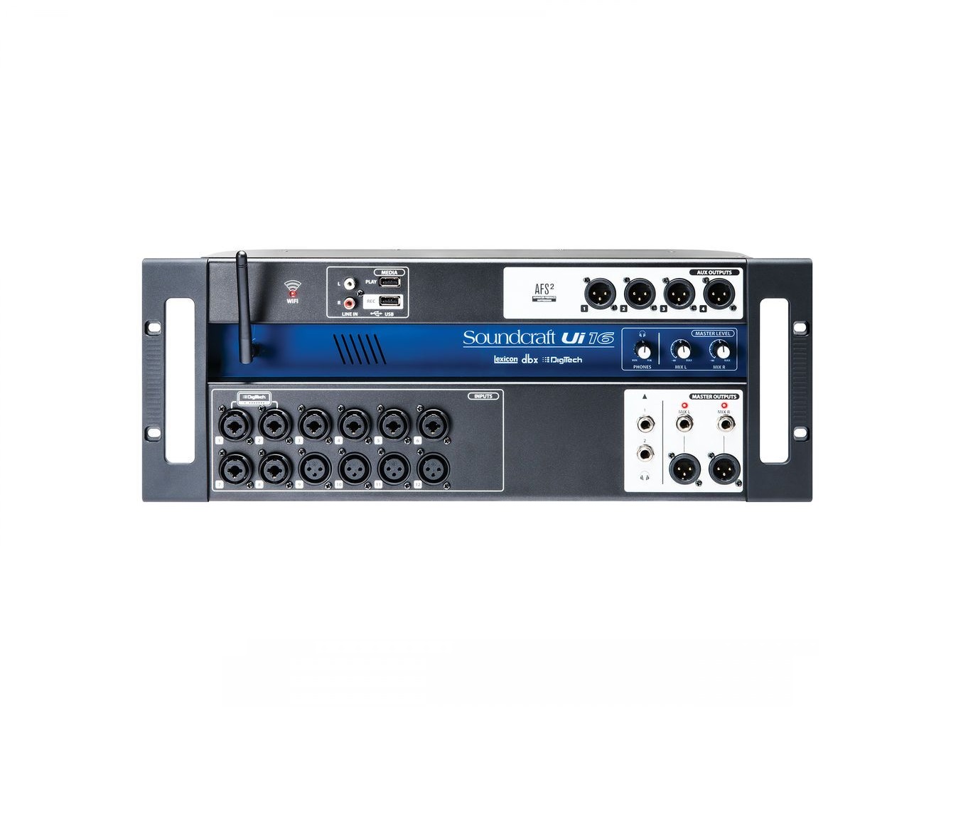 Inoltre, Ui12 e Ui16 dispongono di DSP dbx, Digitech e Lexicon, inclusi dbx AFS2, Digitech Amp Modeling, e altro ancora. Da entrambi i modelli è possibile controllare e richiamare da remoto Gain e alimentazione Phantom, EQ parametrico a 4 bande, filtro passa-alto, compressore, de-esser e noise gate sui tutti canali di ingresso. Equalizzatore grafico a 31 bande, noise gate e compressore su tutte le uscite, oltre a un analizzatore di frequenza in tempo reale (RTA) su ingressi e uscite. Sono presenti anche tre Bus dedicati agli effetti Lexicon per Riverbero, Delay e Chorus. Inoltre, i controlli del mixer includono tra gli altri: Sub Group, Mute Group e View Group.