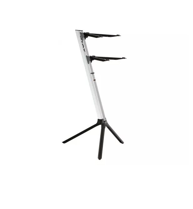Supporto a colonna per tastiere, in alluminio verniciato, altezza 1200 mm, peso 5,8 kg, dotato di 2 coppie di braccetti da 450 e 380 mm per 2 tastiere max 76 tasti con peso non superiore a 40 kg, portata massima 120 kg (nel caso venga installata una terza coppia di braccetti opzionali). Colore nero. Borsa per il trasporto inclusa.