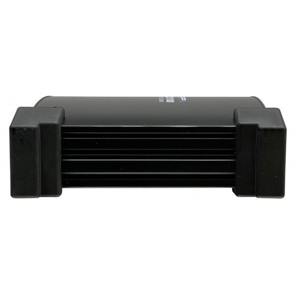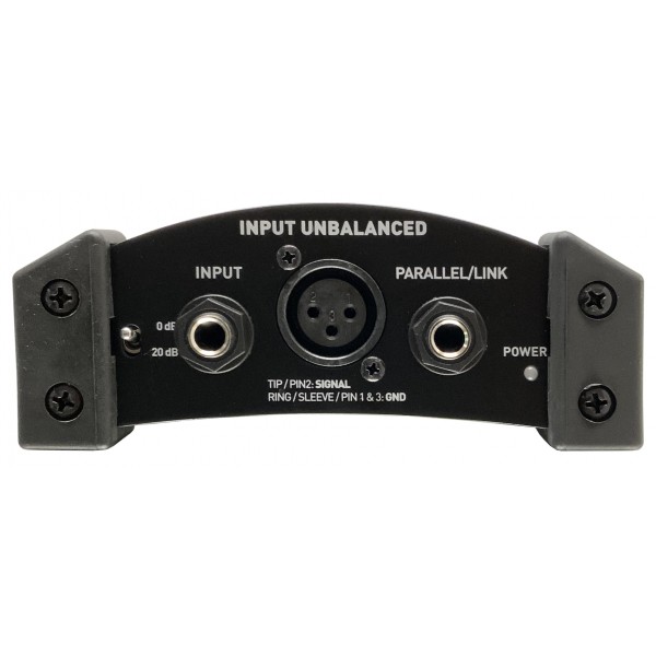 DI Box attiva in un robusto telaio metallico (alluminio/acciaio) con angoli protettivi, colore nero metallizzato.